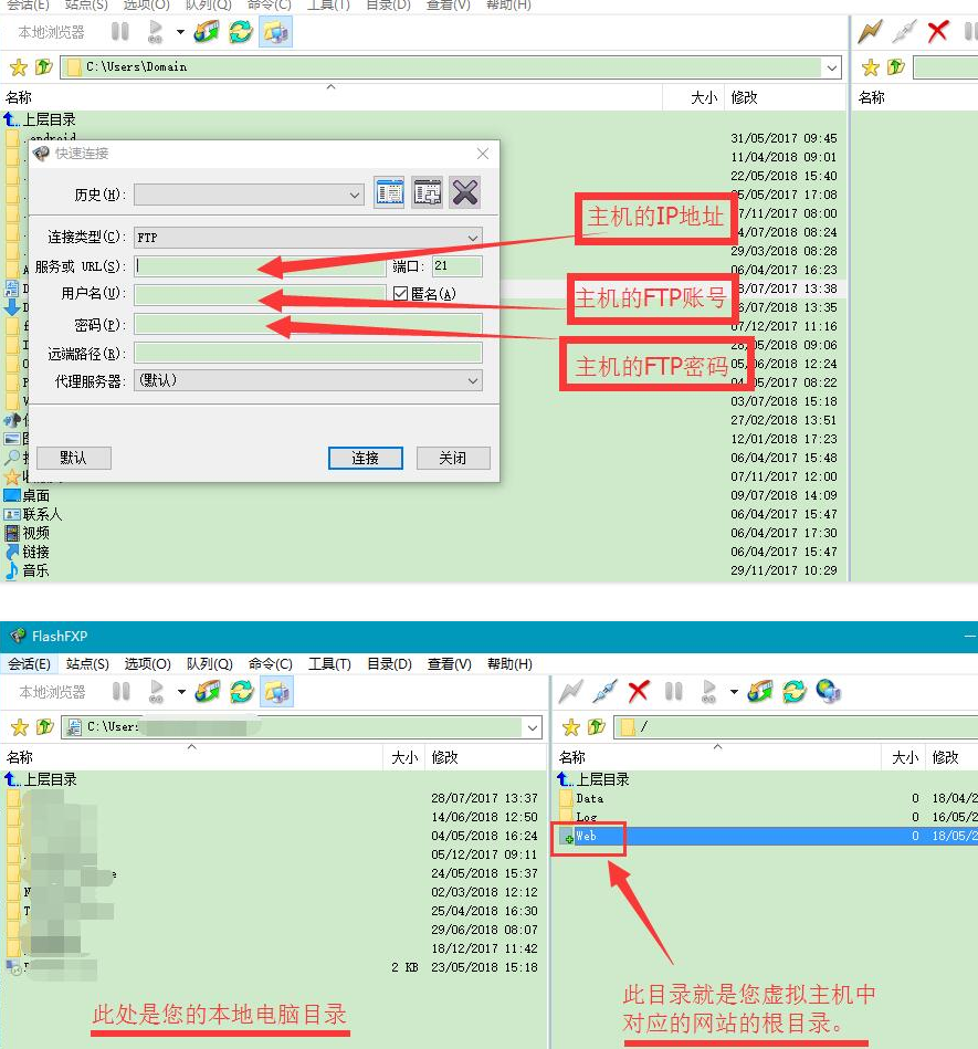 2:选择软件左上方菜单栏中的“会话”-“快速连接”,在弹出来的窗口中分别输入虚拟主机的IP、FTP账号和FTP密码,然后点击下方的“连接”即可。连接成功后FlashFXP右侧会显示您虚拟主机的目录,其中Web目录就是您的网站对应的文件目录,网站文件必须通过FlashFXP传到该目录下方可生效。