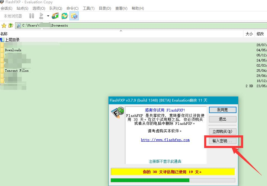 1:下载FlashFXP软件,先解压缩,解开压缩后运行flashfxp.exe文件,第一次运行会弹出注册购买窗口,直接选择“输入密钥。。。”,然后点击“确定”即可。